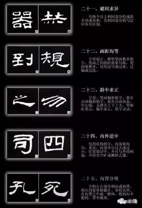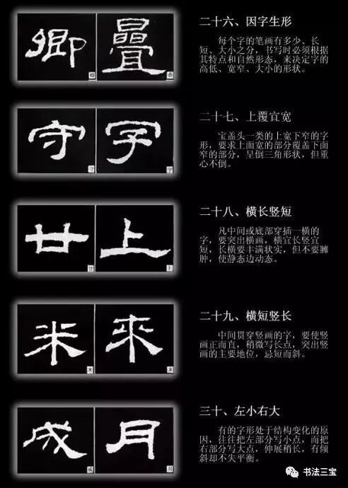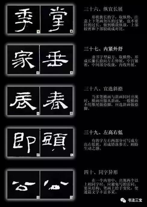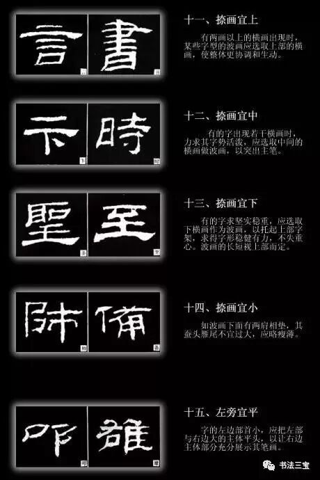点画:隶书的点有多种,大致包括竖点、横点、竖点、横点、撇点、挑点及捺点等,书写时多宜落笔重而收笔轻。